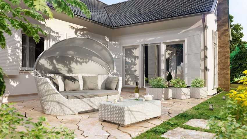 Искусственный ротанг не боится влаги, поэтому в непогоду мебель не обязательно уносить под навес