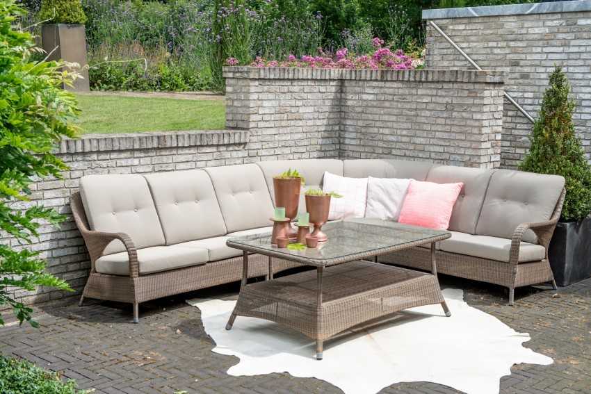 Столовая мебель в саду — это еще не все. Чтобы полноценно наслаждаться приятным отдыхом среди цветущей зелени, необходимо купить еще и садовый комплект. Наборы включают в себя диван, два кресла или стулья, плюс невысокий журнальный столик. Самая модная садовая мебель — это конструкции, выполненные из ротанга, усыпанные большими подушками.