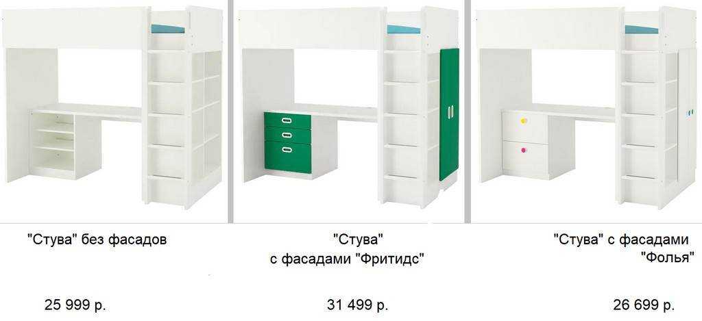 Каркас этой белой модели можно сочетать с фасадами для шкафа и выдвижных ящиков из других серий детской мебели – «Фолья», «Фритидс». Но можно купить и без фасадов – с открытой тумбой и стеллажом. Смотрите ниже несколько вариантов исполнения и цены.