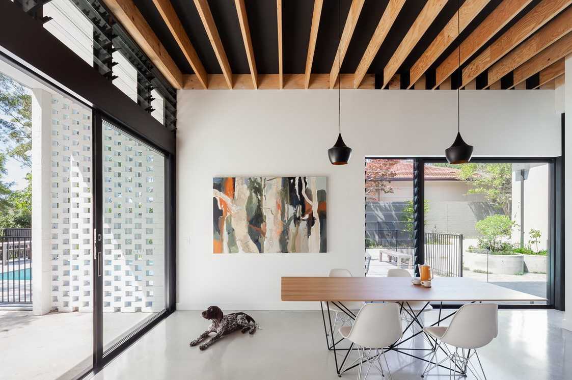 Поперечные деревянные балки на потолке визуально расширят помещение и сделают его более интересным