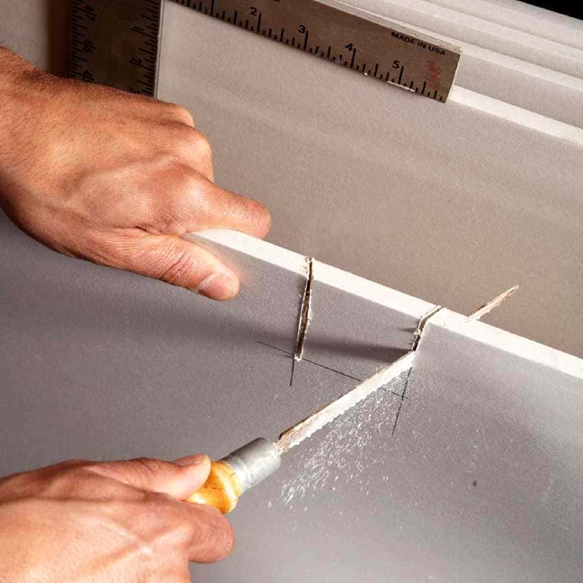 - режут листы на ровной твердой поверхности, гладкой стороной вверх, ножом или электролобзиком;