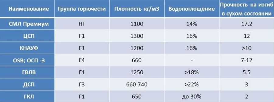 Для наглядного сопоставления основных характеристик СМЛ, с такими листовыми материалами как: ГКЛ, ГВЛ, OSB-плиты, ЦСП, ДСП, листы КНАУФ, ниже представлена таблица: