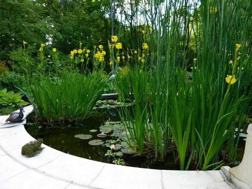 При выборе растений для высадки помните, что некоторые из них способны благоприятно произрастать лишь на определенной глубине. Если толща воды не более 30 см, можно высадить желтый ирис, болотную калужницу, понтедерию сердцевидную. При глубине пруда 30-50 см можно выбрать стрелолист обыкновенный, камыш, рогоз широколистный. В водоем более полуметра глубиной сажайте кувшинки и лотосы, водные гиацинты.