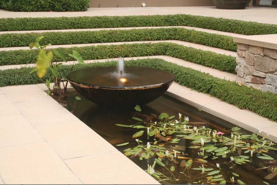 Одна сторона площадки должна обрамляться высокой стеной из камня в форме полуовала с нисходящими ступенями, расположенной ближе к середине площадки, где она окончательно сравняется с уровнем земли. В центральной части этой стенки должен устраиваться каскадный водопад: вода внизу будет падать в небольшую чашу, а далее ручьем поступать в водоем. Это центральная часть ансамбля. По обе стороны от ручья и водоема на площадке, вымощеной плиткой, можно обустроить зону отдыха с лежаками для принятия солнечных ванн или столиком и скамейками для отдыха, детскую площадку или сад с экзотическими растениями в кадках.
