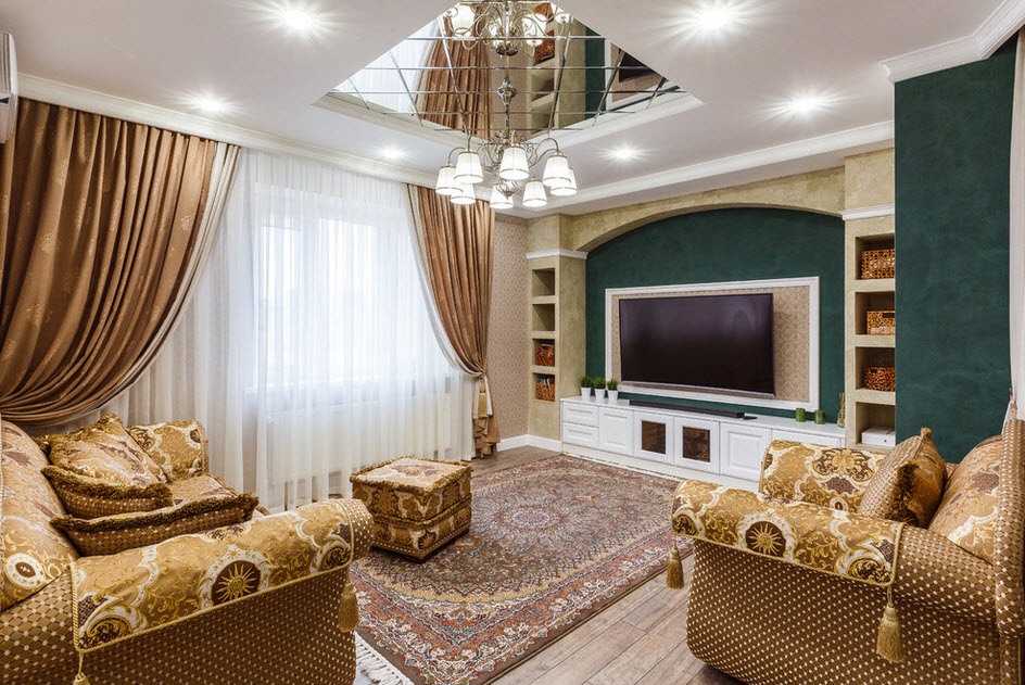 Совет! Если у вас одна очень просторная комната, то лучше всего повесить на потолок две совершенно одинаковые стильные люстры. Это позволит обеспечить полную освещенность и одновременно сохранить стильный облик помещения.