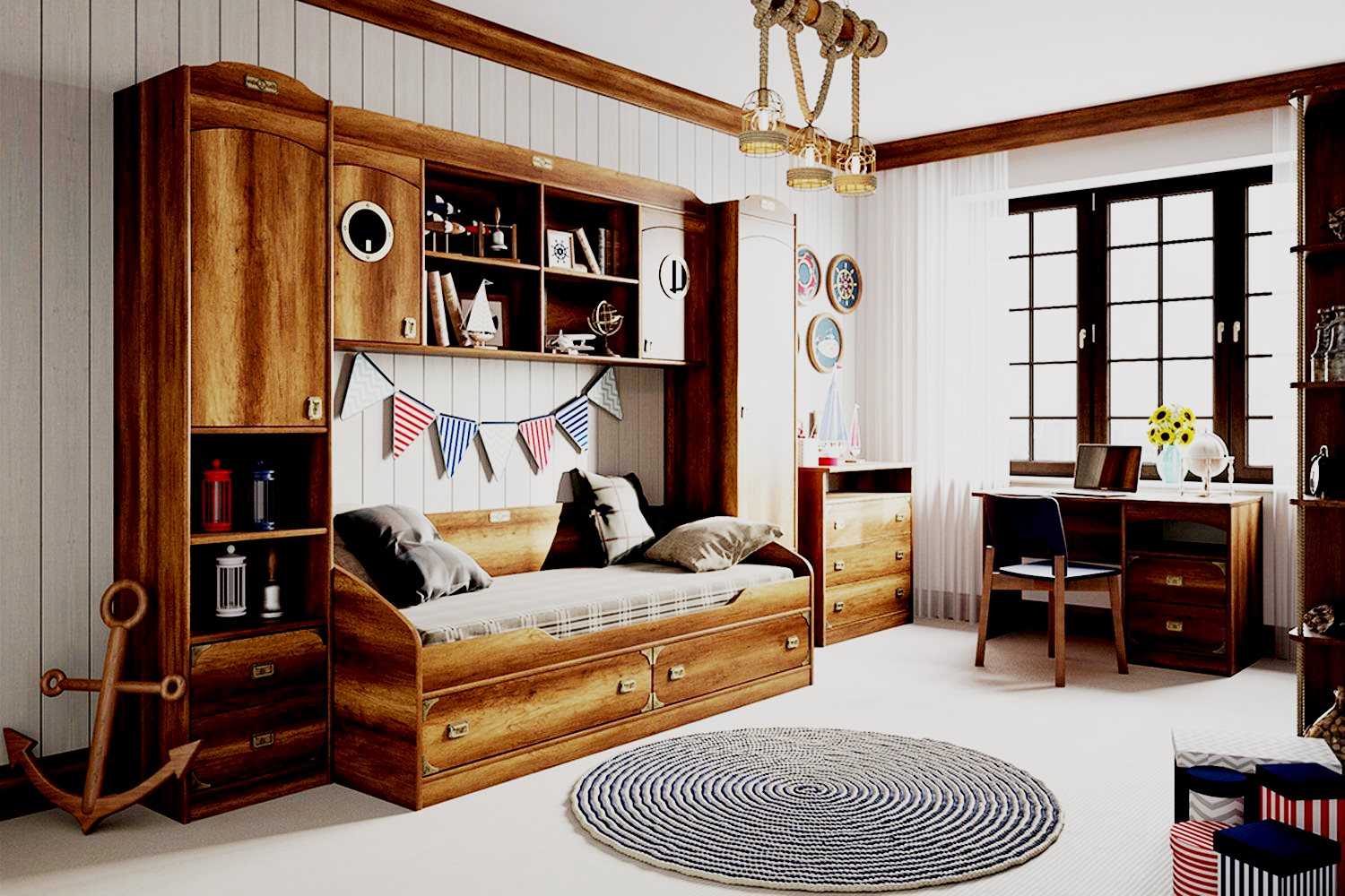 Если желаете приобрести полноценную детскую комнату до 100000 рублей, стоит присмотреться к данной модели. Общий вес набора – 350 кг. Предусмотрена универсальная (правая/левая) сборка. Каркас и фасад выполнены из ЛДСП. Ручки металлические. Кромка – ABS. Направляющие в ящиках – шариковые. Комплект состоит из кровати с двумя ящиками, комода с тремя ящиками, двух столов комбинированного и бельевого, торцевого стеллажа, настенного шкафа с иллюминатором, ограничителем для кровати. Все сделано на совесть. Отзывы о продукции только положительные. Производитель предоставляет гарантию на свое детище в течение двух лет. Минимальный эксплуатационный срок – 10 лет.