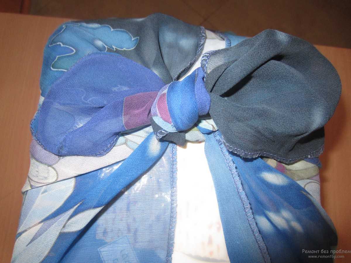 Тренировки начать лучше с хлопчатобумажных тканей. Если узлы не слишком затягивать, сверток быстро приобретает достойный вид. Упаковка в шелковую или креповую ткань требует некоторого навыка, этим вы займетесь немного позже. Потренировавшись, можно научиться упаковывать в фуросики предметы самой различной конфигурации: коробочку с духами, бутылку вина, домашние тапочки и даже меховую шапку.