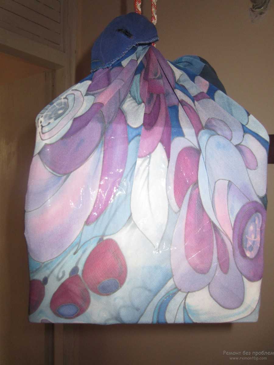 И хотя подобный аксессуар будет выглядеть очень необычно, нужно помнить о том, что если потребуется достать вещь из сумки, нужно будет полностью или частично её развязать. А если нужно будет собрать в такую сумку продукты из магазина, например, потребуется отдельное место для этого. Это не очень удобно в реальности европейского образа жизни. Хотя для модных студенток такая сумка станет отличной альтернативой тяжелым каркасным сумкам. Стоит заранее подумать о том, какой схемой воспользоваться.