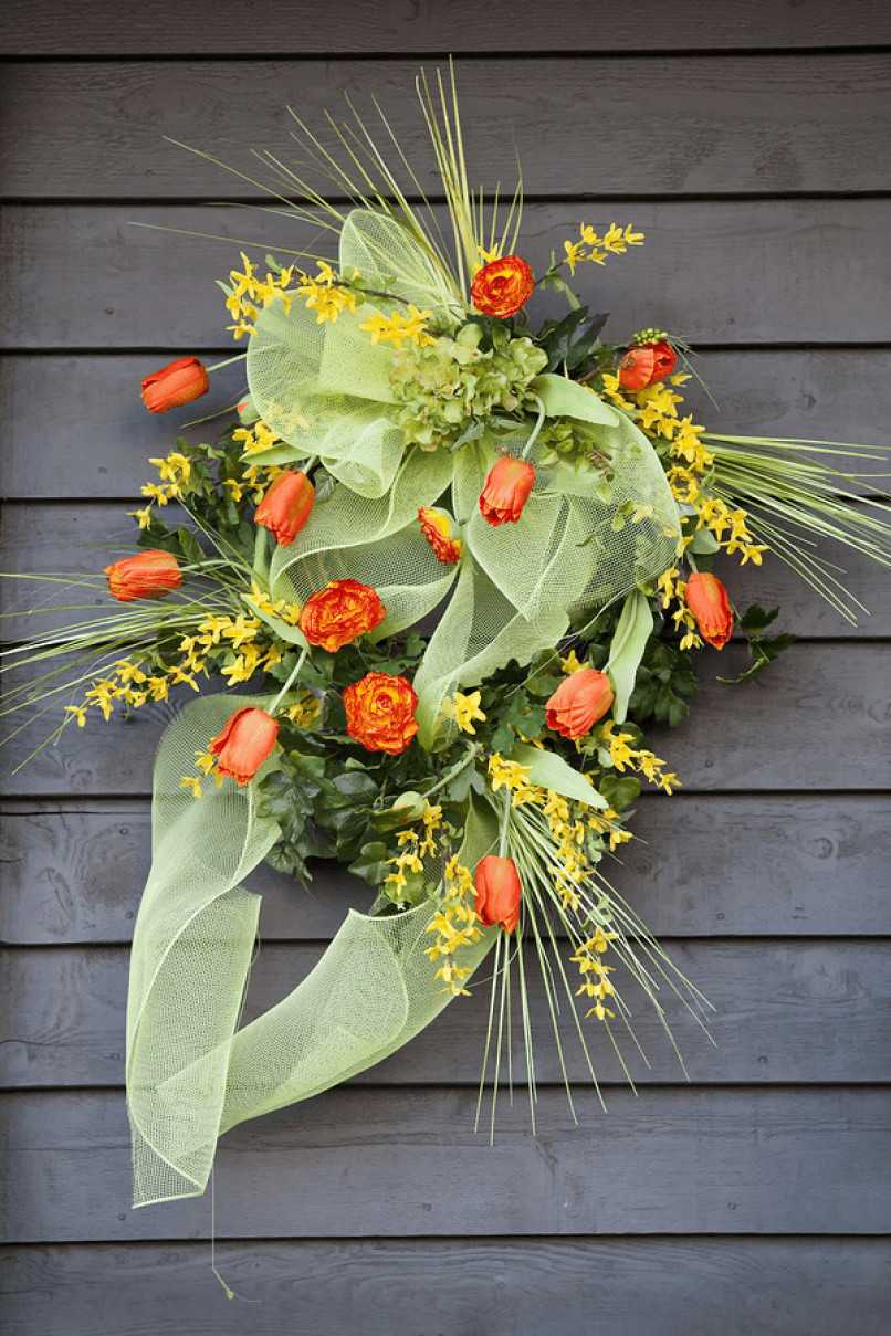 В первом случае нам понадобится мох, лоза, желтые тюльпаны, веточки ивы, зелень и инструменты для работы (ножницы, нож, секатор).