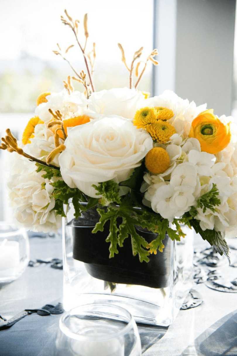 - Для фиксации цветов используем флористическую губку, на которую хорошенько крепим яркие соцветия желтых роз и гербер.