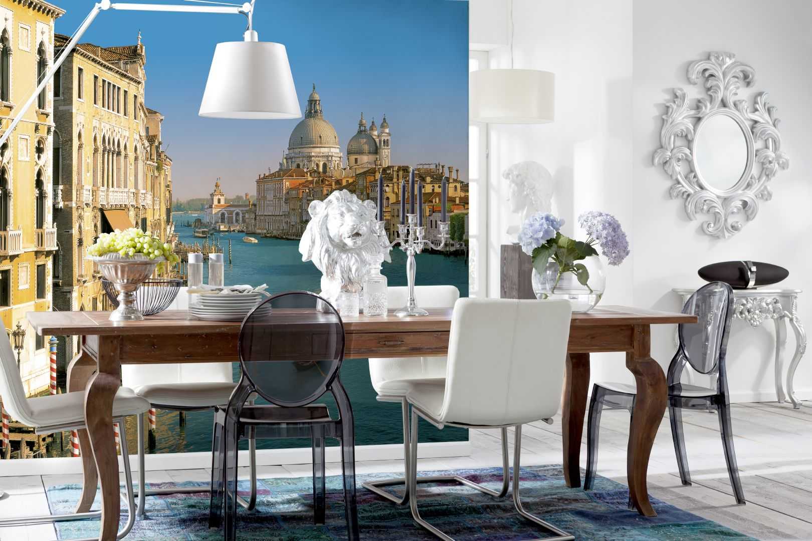 Если кухня с гостиной объединены в одно помещение, надо правильно обозначить границы пространства. Для этого прекрасно подходят фотообои, надо лишь подобрать вариант подходящего размера.