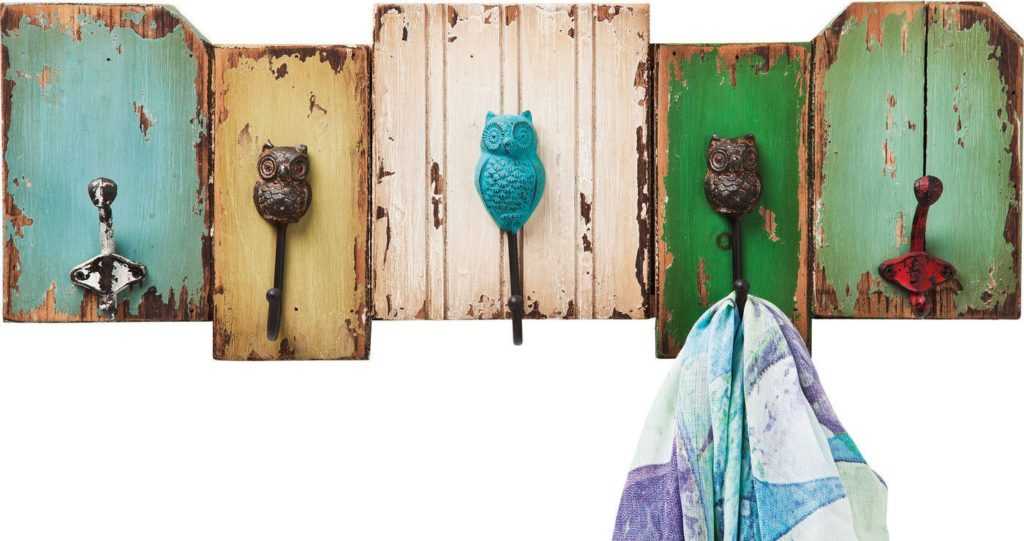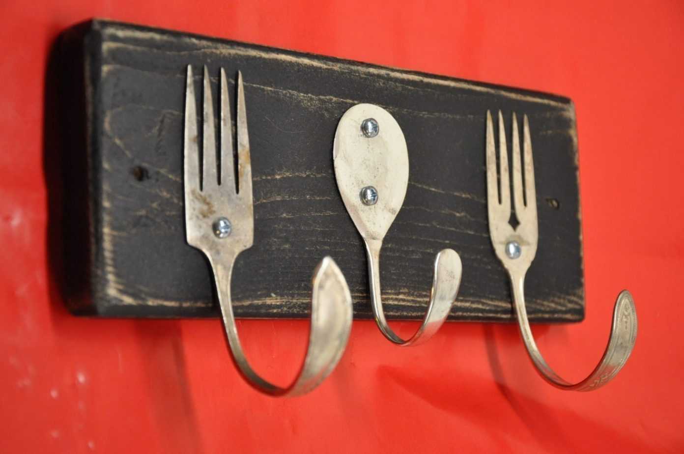 Для крючков используются самые необычные вещи – старые ложки и вилки (только не алюминиевые), гаечные ключи, ненужные ручки от шкафов старой мебели, детали от сломанных игрушек. Крючки могут иметь совершенно хаотичное расположение.