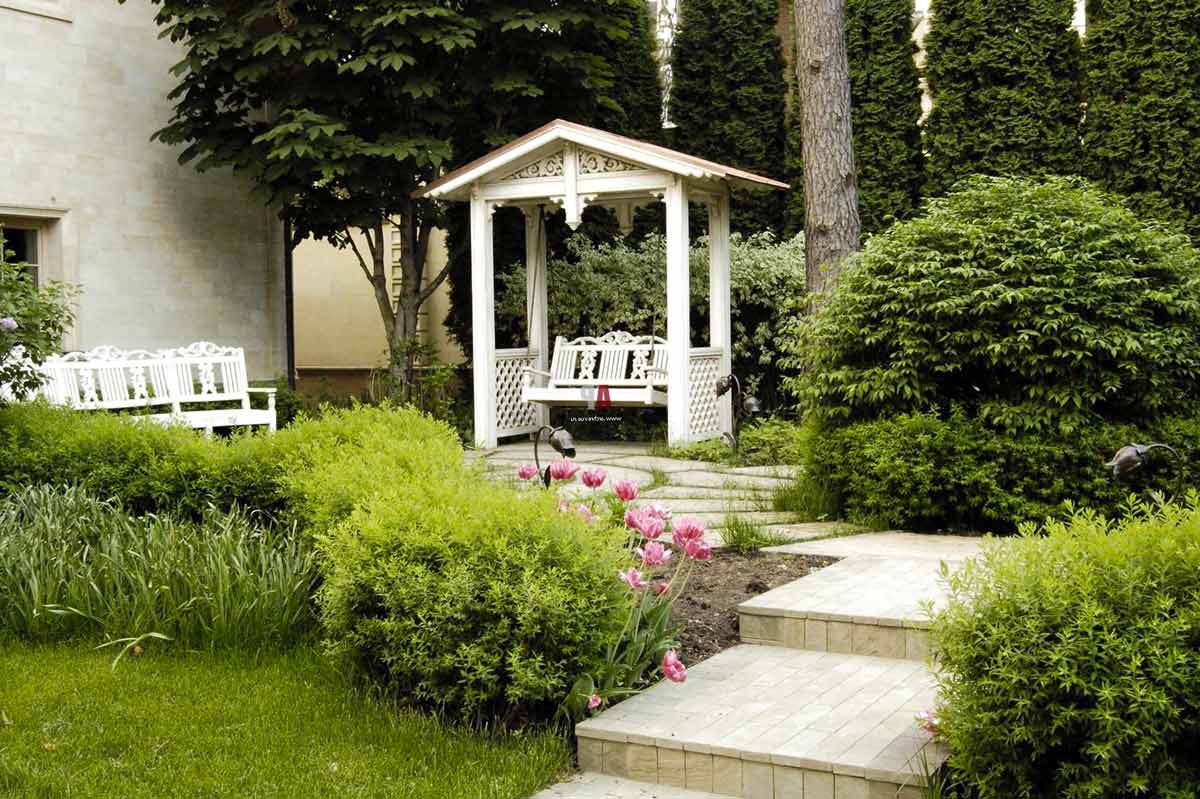 Обратите внимание на фото – беседки в саду потому и называются садовыми, что их место среди растительности (деревьев, кустов, травы):