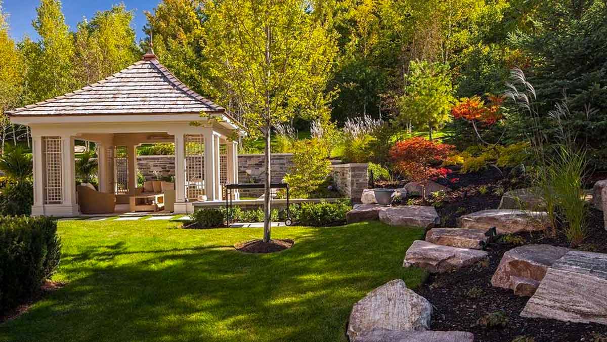 Беседки восьмиугольной формы с прочной кровлей наиболее часто используются в традиционных садово-парковых зонах. Они могут быть привлекательным дополнением, если стиль окружающего ландшафта работает со структурой.