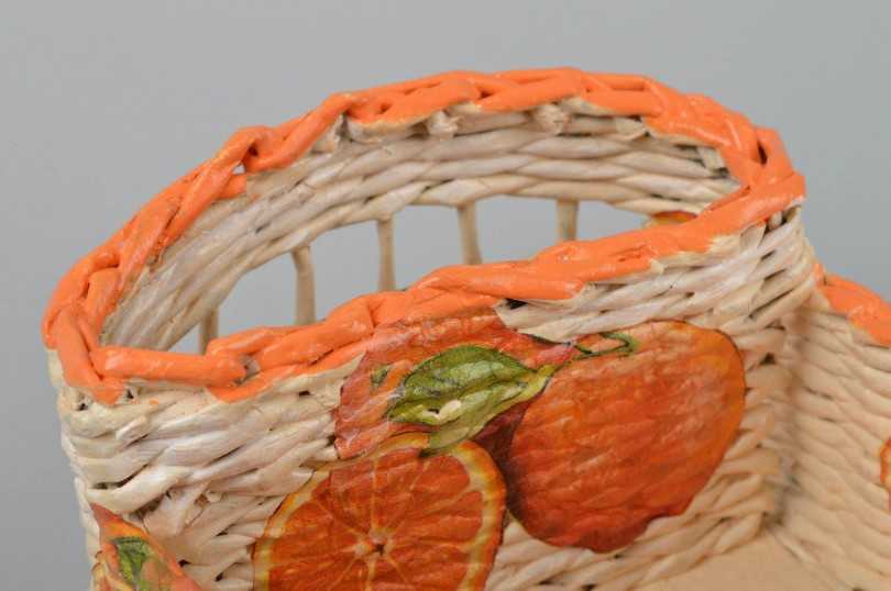 Когда высота достигнута, можно переходить к изготовлению ручек. Для этого по противоположным сторонам корзины делают подъемные ряды, имитирующие ручку. В конце работы трубочки обрезают и прячут внутрь, фиксируя клеем. Отделку корзины оформляют по своему желанию: зачастую это одноцветное разукрашивание акриловой краской.