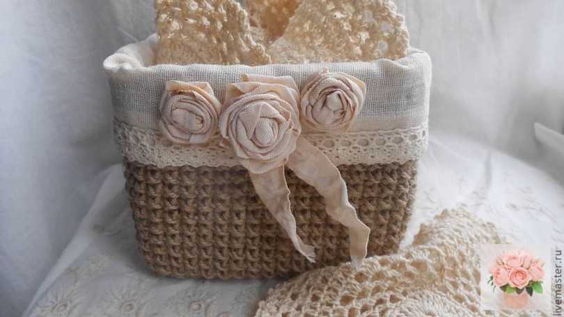 Необычно выглядит корзина из толстой пряжи, связанная крючком.