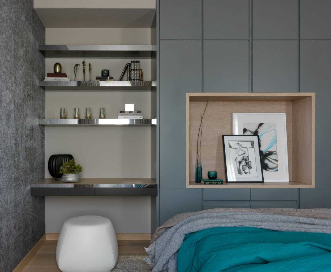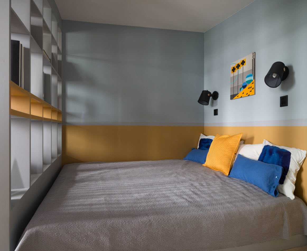 Гармоничное пространство часто имеет собственную подсветку, индивидуальное оформление. В углубление ставят кровать, дополняют светильниками и прикроватными тумбами. Над ложем монтируют полки для: