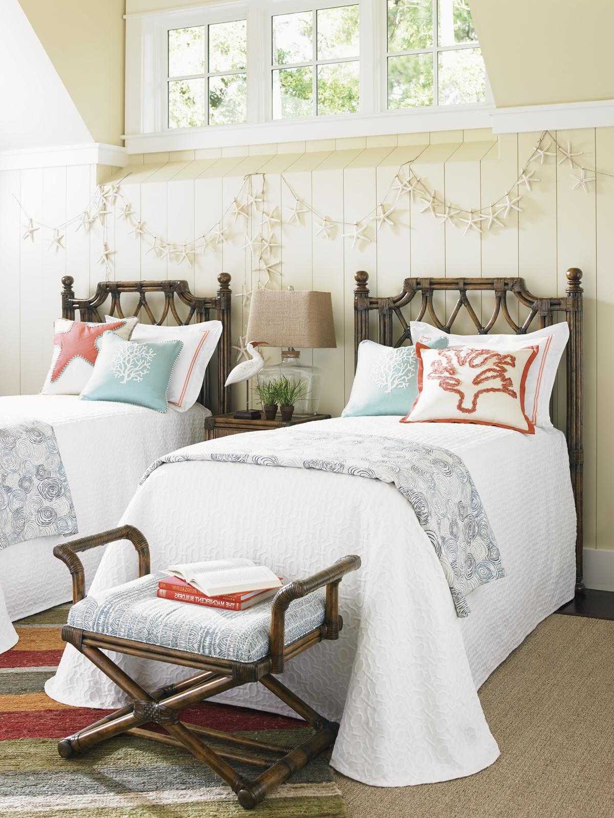 Если вы не боитесь смелых экспериментов, в изголовье кровати можно прикрепить самые неожиданные предметы. Например, лодочные весла. Разные по форме, размеру, цвету, фактуре, такие аксессуары, несомненно, станут центром внимания в спальне. Благодаря спокойной нейтральной расцветке это необычное изголовье не мешает вашему отдыху. Подобрав другие предметы декора в природном стиле, вы создадите в спальне уютную теплую атмосферу рыбацкой деревни: