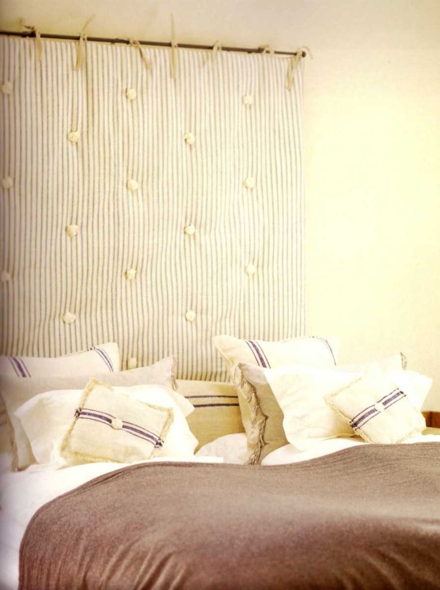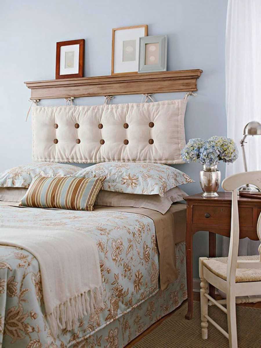 Проще всего изготовить самим мягкое изголовье. Обычно на лист ДСП наклеивают поролон, обшитый тканью. Дополнительная отделка изголовья контрастной тканью – очень практичный вариант, т.к. текстильную дорожку всегда можно заменить, тем самым внести разнообразие в интерьер: