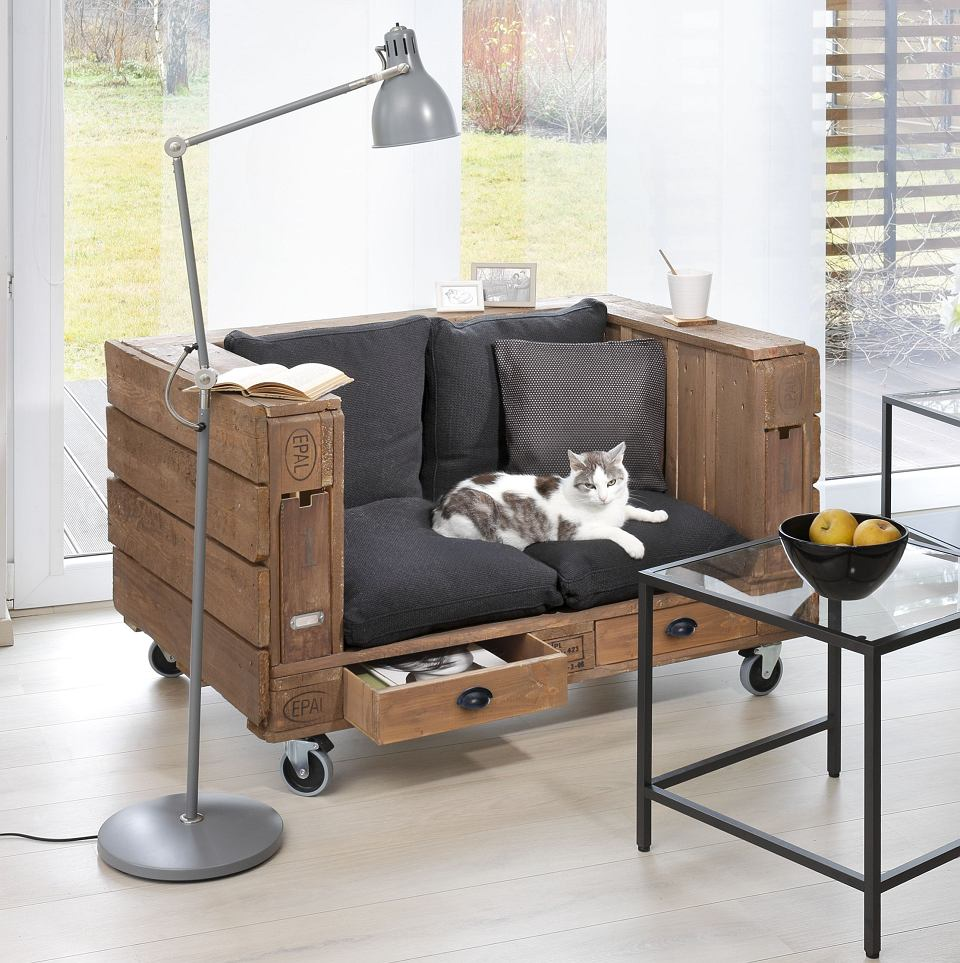 Довольно часто на фотографиях интерьеров можно увидеть диваны или скамьи из паллетов. Такой диван может быть снабжен мягким сидением и спинкой. Можно сделать подлокотники.
