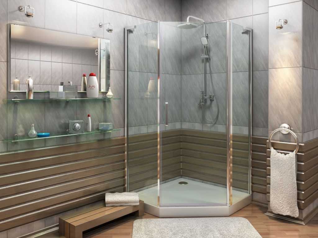 В узком помещении отличным вариантом будет встроенная кабина подходящих габаритов, для устройства которой понадобятся лишь шторки или двери из стекла. Это недорого, практично и удобно.