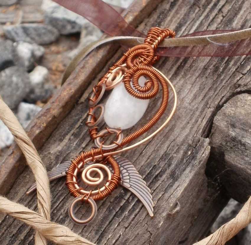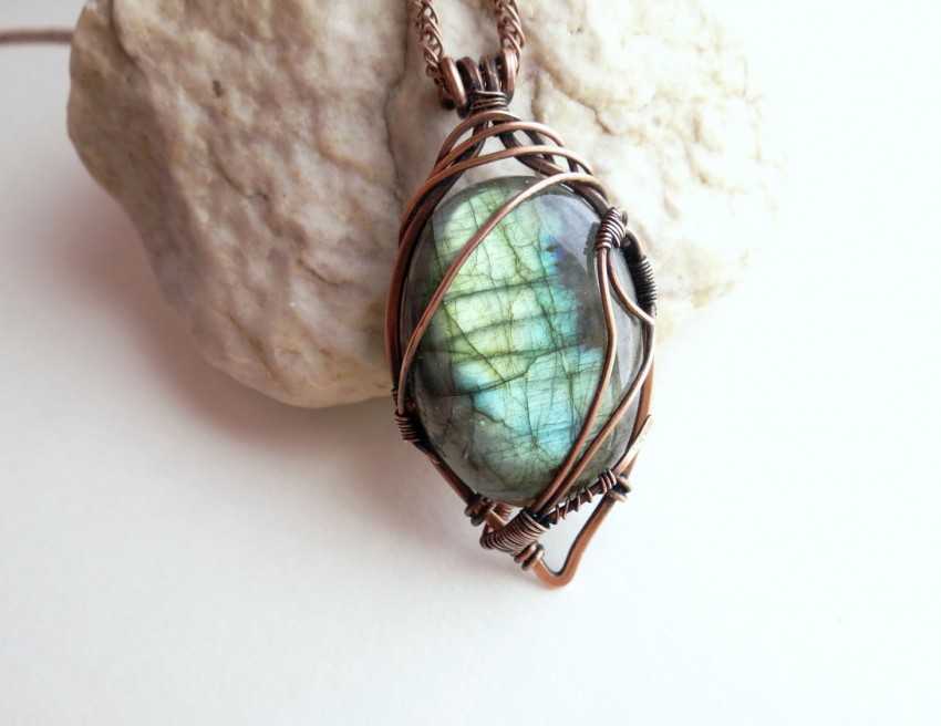 Сделав декоративную оплетку нужной длины, требуется продеть один из свободных концов в дырку камня. После этого разместить проволоку по периметру центра украшения. После этого оставшиеся концы медной проволоки маскируют под декоративным завитком в верхней части кулона.