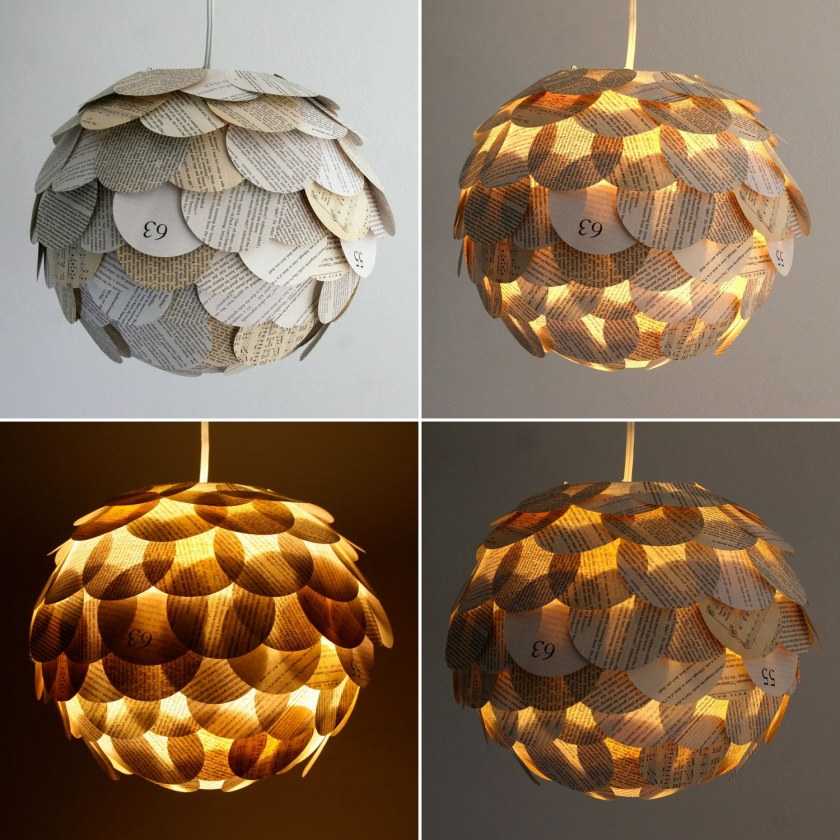 Малозатратным вариантом станет изготовление абажура из бумаги. Такие изделия хороши тем, что изготовить их сможет даже неопытный мастер, а результата можно добиться очень эффектного. Ведь подойдут для осуществления задумки как глянцевые листы из журналов, так и старые газеты, салфетки для декупажа, рисовая бумага, а еще этот метод позволяет украсить абажур любым принтом, распечатанным на принтере, что сделает лампу оригинальной и единственной в своем роде.