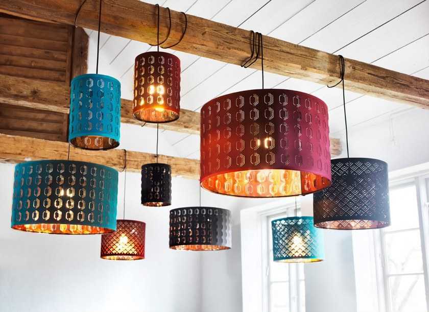 По тому же принципу светильники своими руками делаются из консервных банок, окрашенных в нужный цвет, дуршлагов, кастрюль и даже пирамидальных терок.