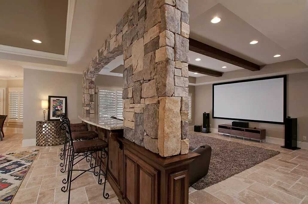 Не менее эффектна барная стойка, облицованная декоративным камнем, а также, всевозможные стеллажи, полки, подиумы и ниши. Более того, барной стойке можно придать самую невообразимую и причудливую форму, используя для этого облицовочный камень с разнообразными формами.