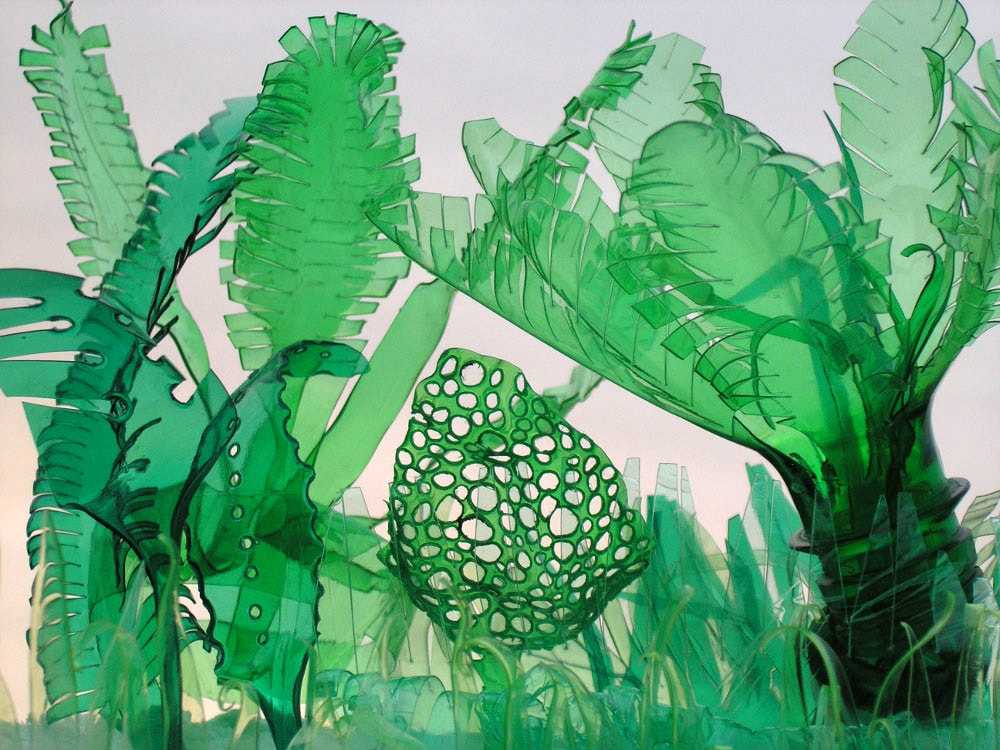 Строительные остатки, такие как рейки, камни, куски кирпича и шифера, капроновая сеть, плитка используются как основа, а из бутылок получаются разнообразные фигуры.