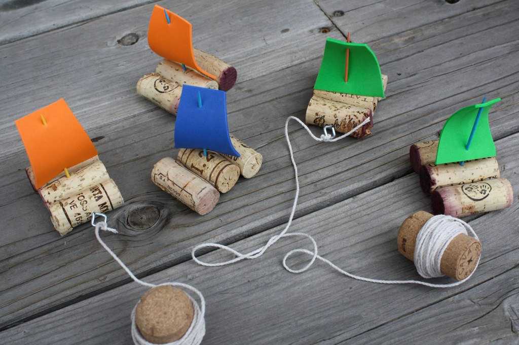 Что же еще можно сделать из пробок от вина? Ребятам постарше, особенно мальчишкам, по душе придется кораблик. Требуется лишь соединить три изделия, связать их бечевкой. Парус смастерить из зубочистки и треугольника цветной бумаги. Элементарное плавучее средство готово. В этом деле не нужны особые знания кораблестроения, за все отвечает ваша фантазия.