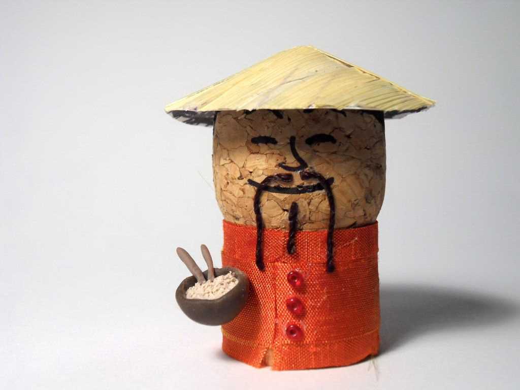 Если пробку просто раскрасить, дорисовав ей глазки, носик, улыбку, то это уже получится игрушка. Вставить вместо ручек проволоку, дополнить лоскутом ткани. Немного фантазии, и обычная пробка от вина или шампанского превращается в человечка.