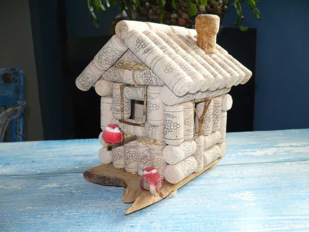 - Домик. Для создания сказочной избушки понадобится достаточно много пробок, масса времени и сил, но занятие получится весьма увлекательным. Сначала нужно изготовить пол — склеить порядка 9–16 заготовок так, чтобы получился квадрат. Потом можно начинать «строить» стены. После этого приступают к работе над крышей: ее можно сделать из разрезанных на маленькие кружки (либо распиленных напополам) пробок.