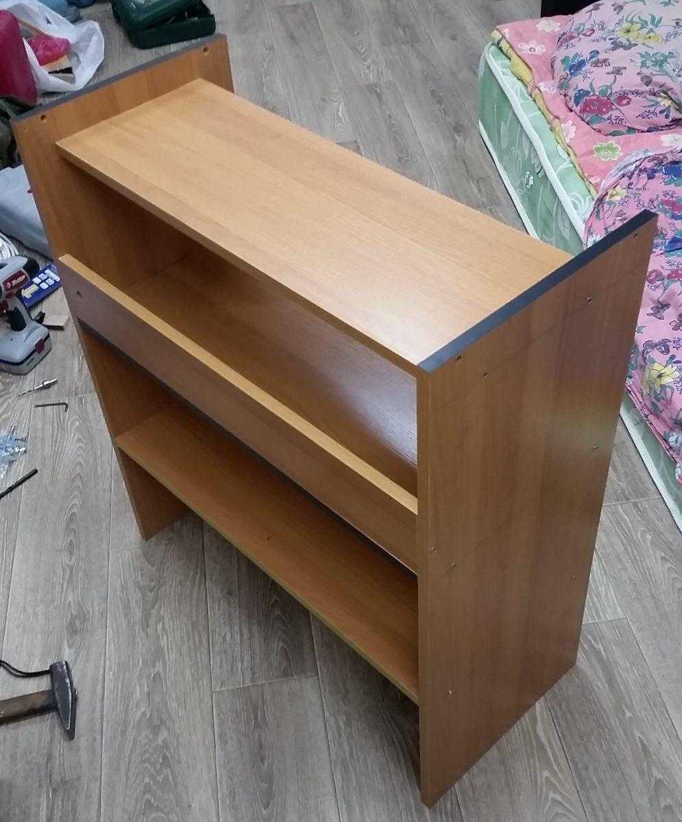 Затем клеим боковые стенки с верхней дощечкой. Так выглядит полусобранная полка.