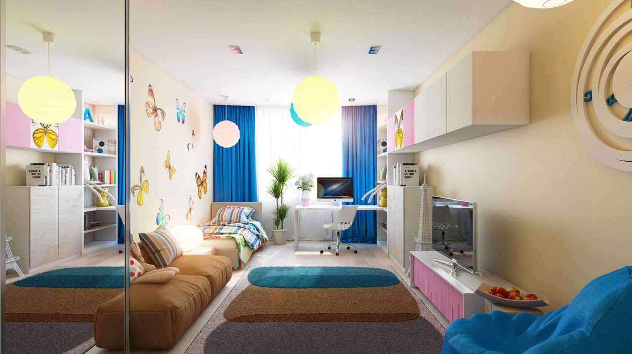 Если комната рассчитана на нескольких детей, то необходимо учесть все интересы, разграничив функциональные зоны таким образом, чтобы, например, один ребенок, сидя за рабочим столом, не мешал другому спать.