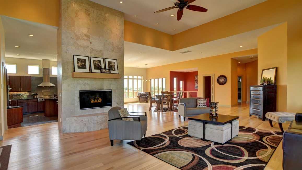 - Камин из натурального камня делает обстановку уютной и домашней.