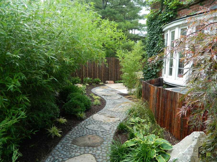 - В японском стиле. Тропинки можно выложить плоскими камнями, расположенными друг от друга на расстоянии шага. Между ними нужно насыпать мелкие камешки. На пути можно установить невысокий деревянный мостик через стилизованную каменную реку, пересекающую тропинку. По обе стороны нужно высадить деревья, высокие кустарники, ветки которых будут склоняться над пешеходом.