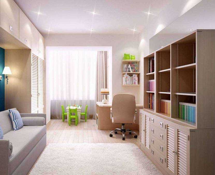 Важно! Если дети в семье – правши, разместите стол для них так, чтобы естественный свет падал с правой стороны, для левшей – с левой. В любом случае оптимально размещение как можно ближе к окну как одному из главных источников света в дневное время. Для удобства светильники можно встроить в нижнюю часть подвесных шкафов или полок – так они буду занимать мало места и смотреться очень современно