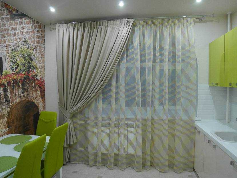 - если кухня длинная и узкая, можно повесить темные шторы, этот прием зрительно приблизит дальнюю стену;