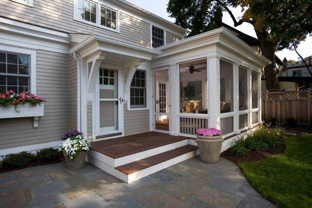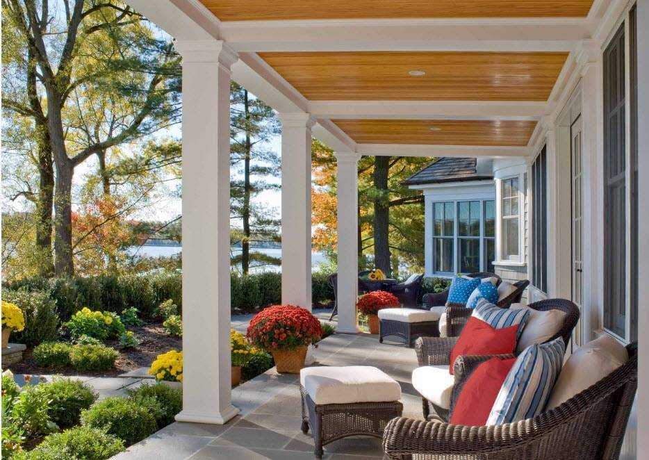 Создать красоту вокруг главного входа помогут подобранные в общую цветовую гамму высокие горшки с цветами