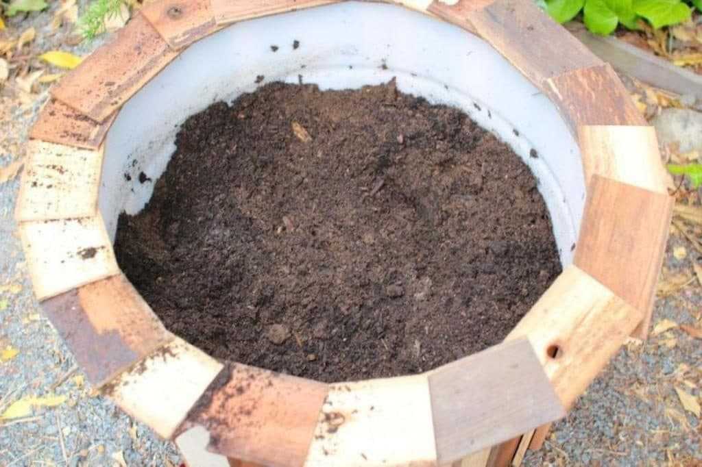 Горшки заполняются почвенной смесью. Большую часть занимает компост. Затем высаживаются растения. Поверх выкладывается мульча, которая защищает землю от пересыхания. Чтобы предотвратить гниение древесины рекомендуется обработать поверхность лаком. Это позволит увеличить срок изделия.