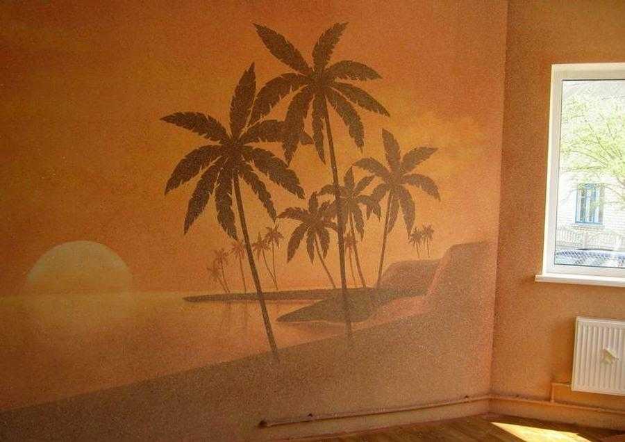 Следующее фото демонстрирует рисунки на жидких обоях, выполненные с помощью трафаретов своими руками:
