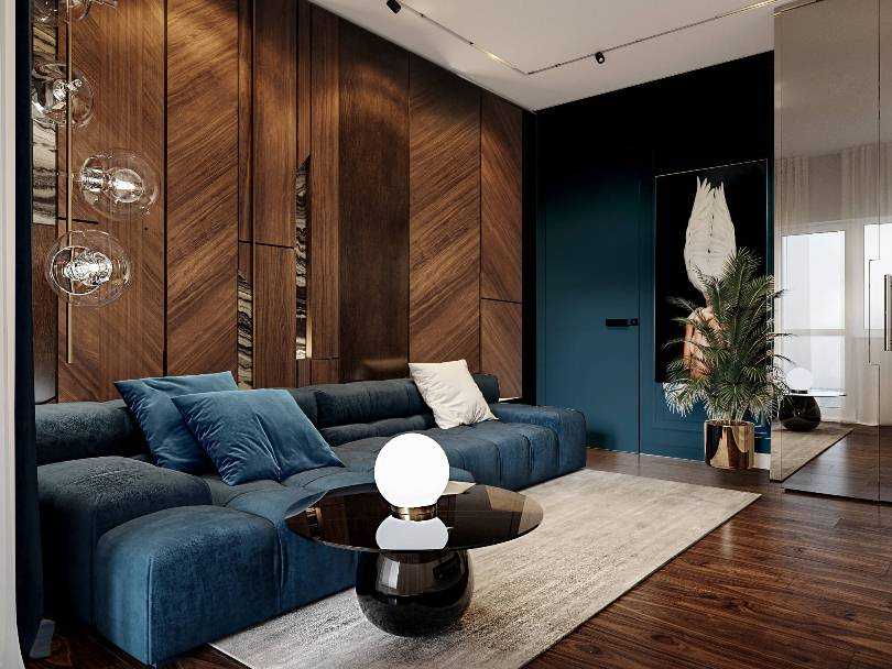 Ольховые тона отлично дополняют яркие обои. Разбавить синий насыщенный цвет и придать ему мягкости также по силам ольховым тонам. В результате получится нарядный интерьер, но уютный и спокойный. Неординарный, эффектный и стильный дизайн заряжает оптимизмом и позитивом, прекрасный вариант дизайна гостиной.