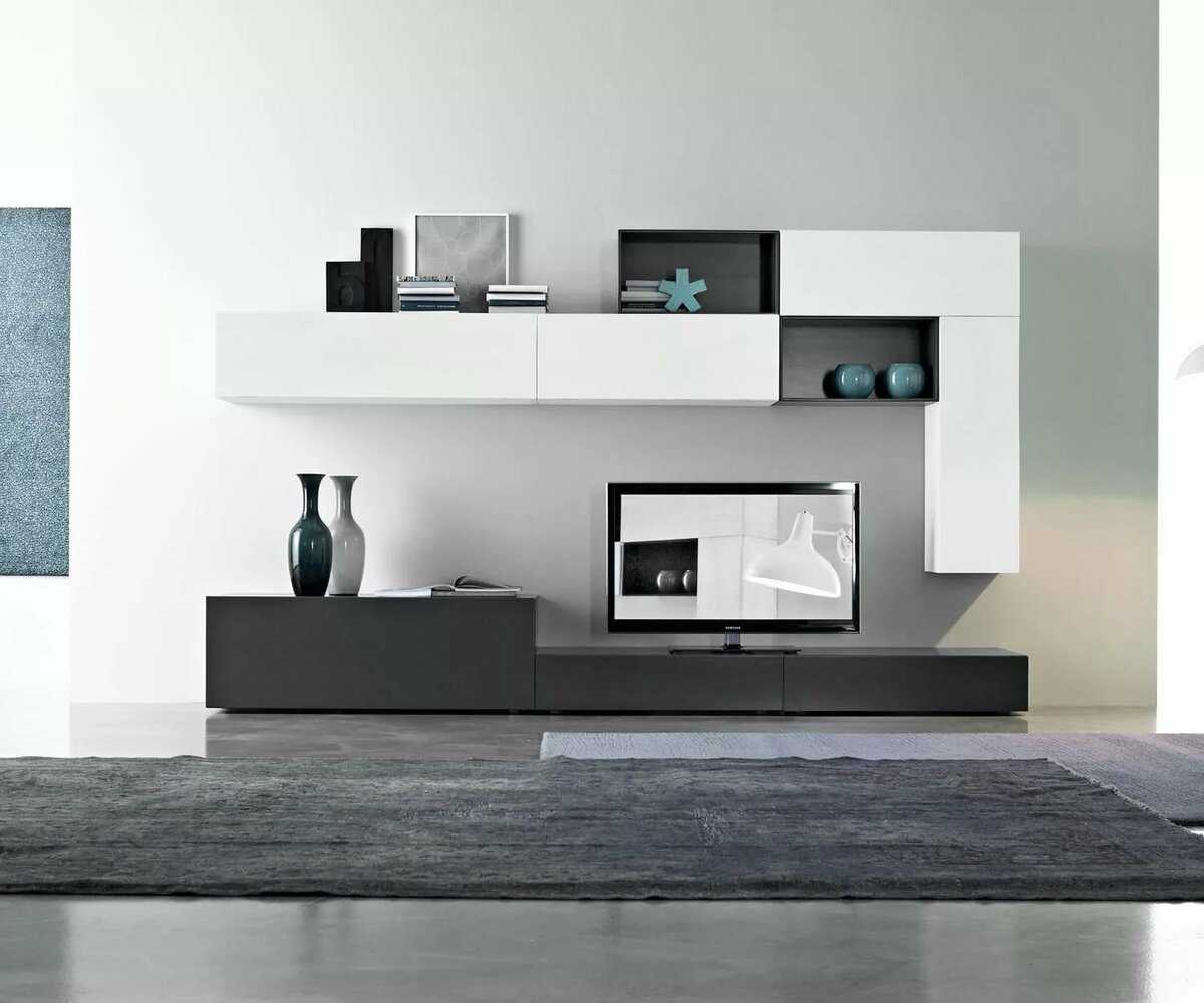 • Телевизор. Телевизионный экран прямоугольной формы, расположенный в центре стеллажа-перегородки, гармонично впишется в общую геометрическую композицию и будет прекрасно сочетаться с другими элементами декора.