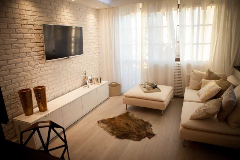 Белая кирпичная стена в гостиной