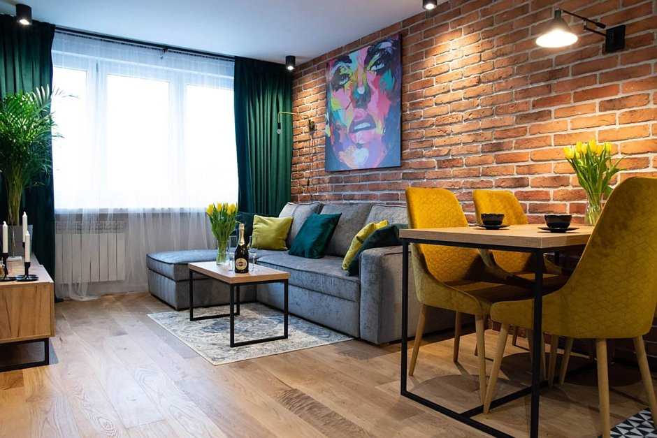 Кирпич в гостиной — минималистичный дизайн с контрастом