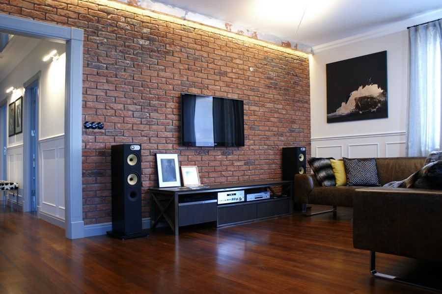 Кирпич в гостиной может быть и обыкновенной стеной, открытой при ремонте из-под старых слоев штукатурки. Чаще всего это происходит во время ремонта в многоквартирном доме. Такой кирпич необходимо тщательно очистить и защитить подходящим пропиточным средством (его можно купить в строительных супермаркетах).