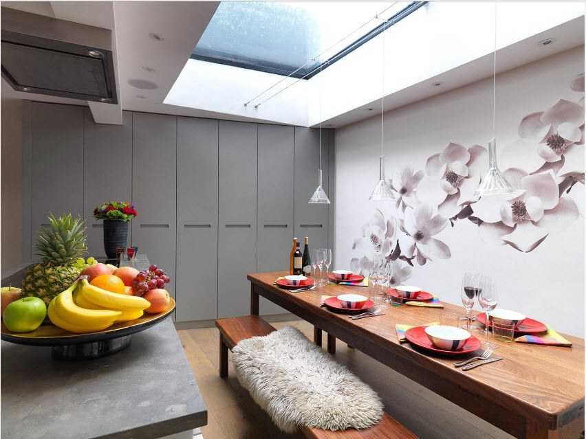 На кухне такой вариант выглядит необычно, но весьма прилично. Выбирайте на малую кухню мелкие цветы на светлом фоне, а в большую крупные. Выбирайте фотообоям с ярким рисунком, наклеив их на свободной стене помещения. Цветочки на кухне предпочтительно использовать в стиле Прованс или Кантри.