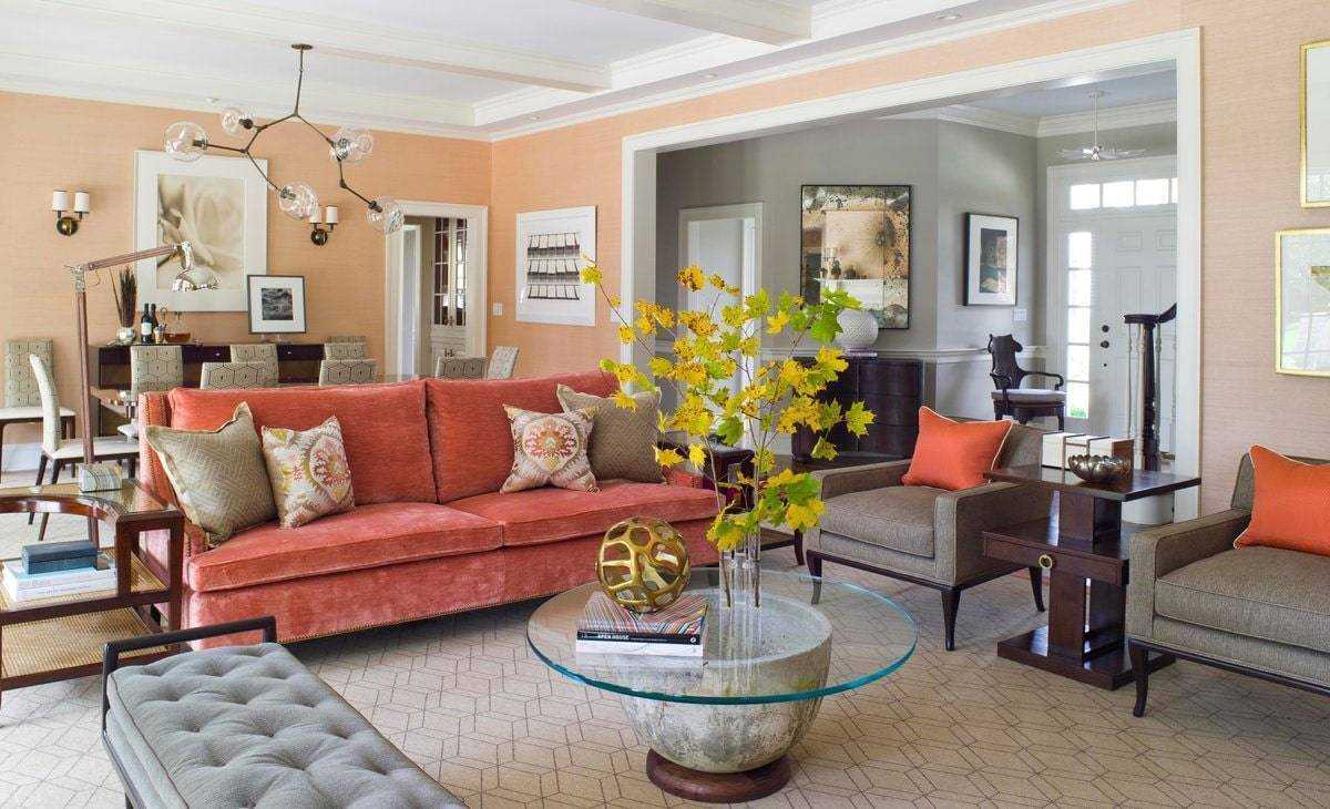 С персиковыми обоями подбирается мебель из натурального дерева. Элементы обивки белого, бежевого и молочного цвета. Холодные краски разбавляются теплыми орнаментами и рисунками. Бежевый диван сочетается с зеленым изображением и оранжевым кантом.