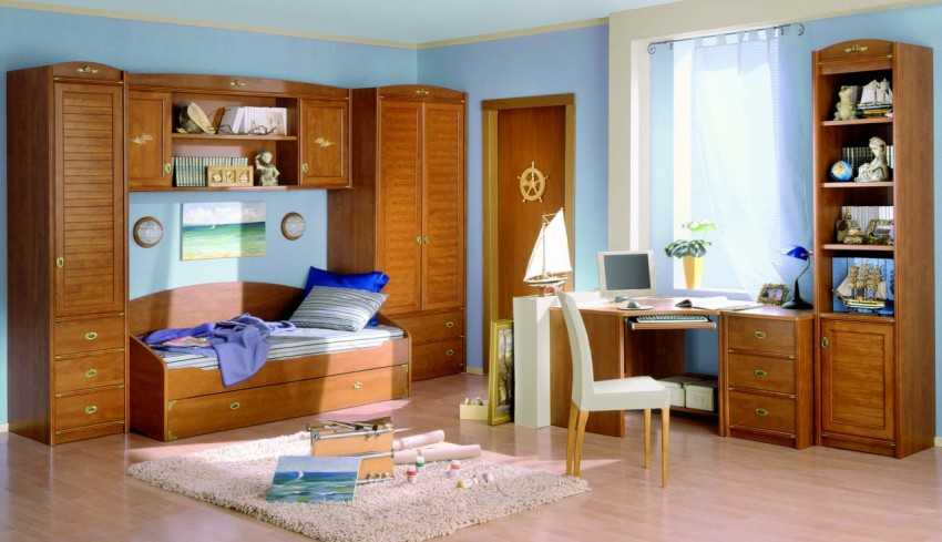 - Мебель лучше подобрать с натуральной древесной текстурой темного или золотого цвета, окрашенная мебель в красный, белый, коричневый цвет. Кровать может быть в виде сказочного корабля или обычной с балдахином-парусами.